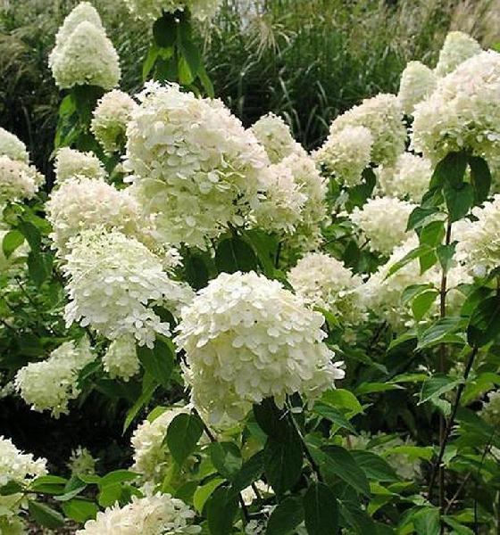 соцветия (до 25-30см), состоящие практически из одних стерильных цветков, в начале цветения в тени и на плодородных почвах - зеленоватые (цвета лайма), на солнце - чисто-белые, в конце цветения розовеют. Цветет с конца июля до конца сентября.Светолюбива, выносит полутень. Зимостойка. Требовательна к наличию влаги в почве. Предпочитает плодородные, рыхлые, кислые почвы. Не выносит извести в почве. Один из лучших сортов метельчатой гортензии, выведенный в Голландии. Эта гортензия не требует никаких подставок и подпорок под них и прекрасно сохраняет форму куста. По признанию очень многих садоводов Лаймлайт - самый устойчивый, надежный и красивый сорт метельчатой гортензии.